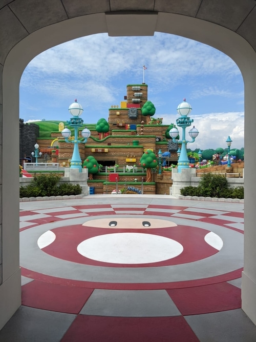 A colorful star plaza emerges as you make the final turn on the path. In Star plaza, a large green warp pipe is marked by a giant marquee saying "Super Nintendo World." In front of the marquee is the perfect spot for a photo op. As you enter the green warp pipe, you hear warping noises and beams of light. You are warped into Peach's Castle as you make your way to the end. The tunnel's architecture blocks your direct view into the land to emphasize the warping effect.