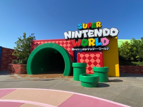 A blue marquee near the Waterworld marks the entrance to Super Nintendo World.